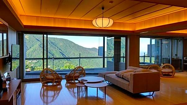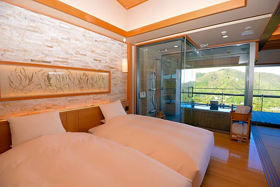 Guests will have a special experience as this twin room features a private open-air bath. The spacious twin room offers air conditioning, a tea and coffee maker, a balcony with mountain views as well as a private bathroom featuring a bath. The unit offers 2 beds.